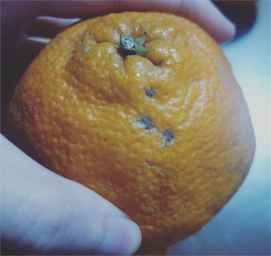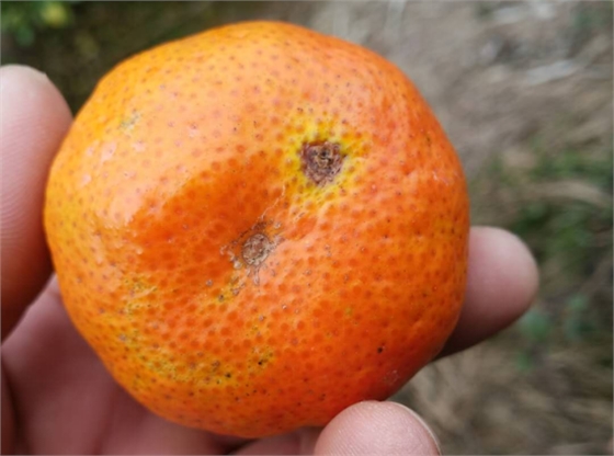 初期果皮出現(xiàn)形狀不規(guī)則的淺綠色或淡黃色的病斑,病斑內(nèi)油胞顯著突出,油胞間的組織稍凹陷。